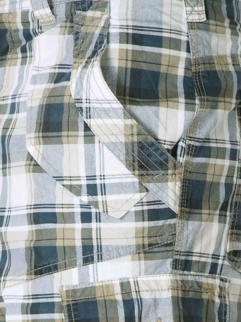 Blue, white and khaki check shorts with a looped waist with a button and zipper closures, two side pockets, and two buttoned flap pockets on the thighs and two back pockets with buttoned flaps