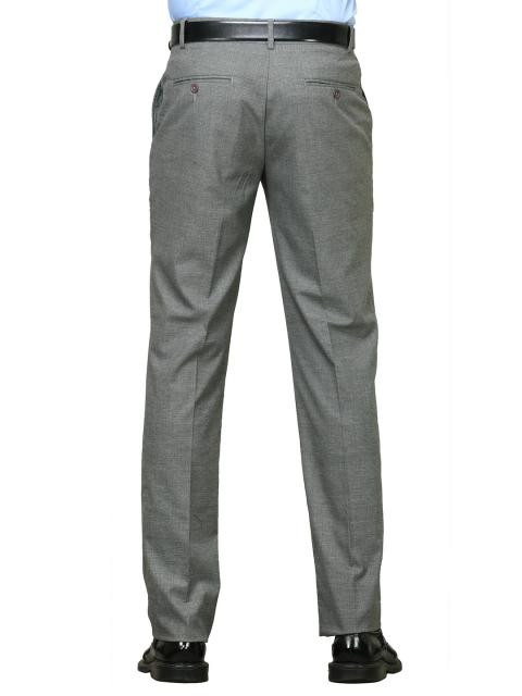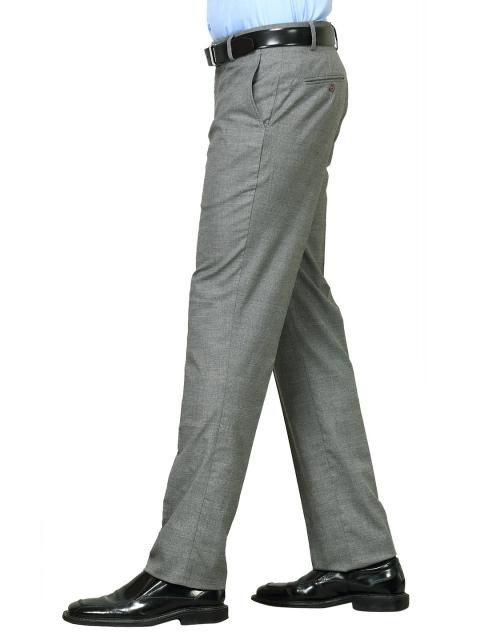 Grey full length formal trousers with self checks, made of cotton blend PV fabric for stretchability, has flat front with two pockets on the sides, two welt pockets on the back, metal zipper and button closure, loops on the waist to secure a belt and reinforced stitch detailing along the crotch area and the hemline