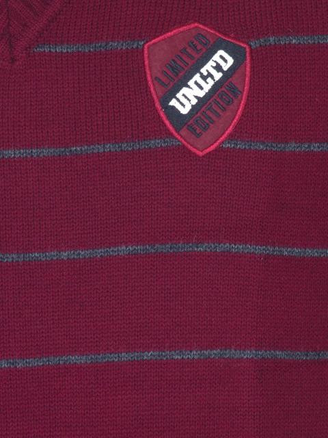 Maroon striped sleeveless sweater made of 100% cotton, has a V-neck, ribbed arm holes, neck and hem, and has a brand badge on the left chest