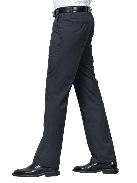 Black full length formal trousers made of TR yarn dyed cotton blend PV fabric for stretchability, has flat front with two pockets on the sides and one patch pocket inside the right one, two pockets on the back with metallic embellishments, metal zipper and button closure, loops on the waist to secure a belt and reinforced stitch detailing along the crotch area and the hemline