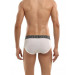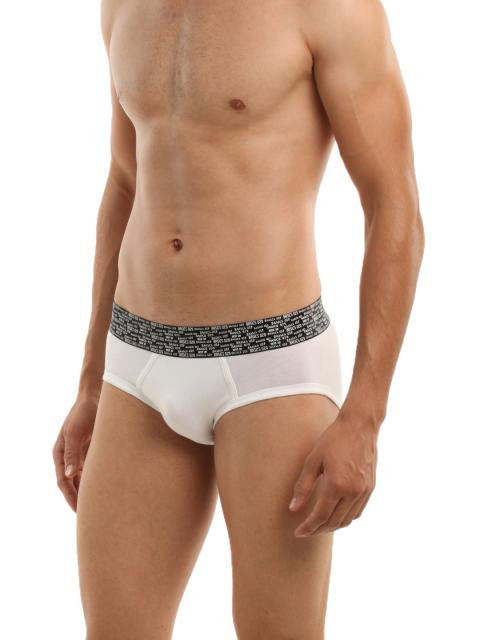 White hip brief that has a broad elasticated waistband with branding, double layered pouch and brand tag on the inside of the waisband