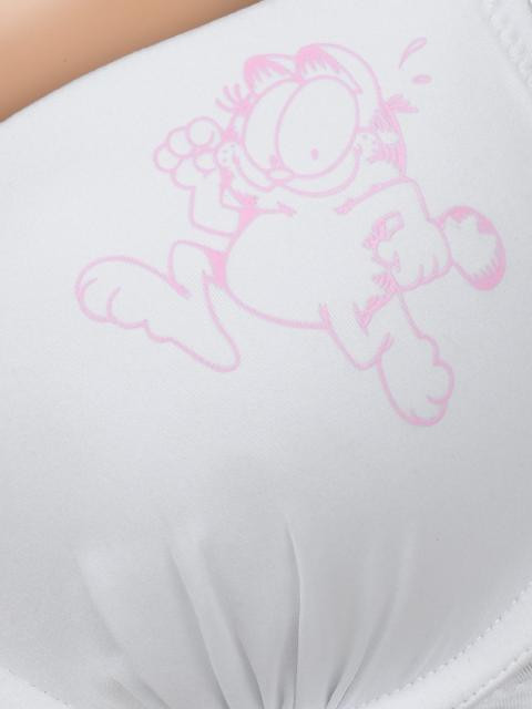 White and pink, underwired, push up bra, soft padded cups with brand print on the left cup and bow in the middle with brand print, plunging neckline, adjustable straps, lace stripe on the side wings and three row hook closure