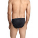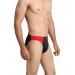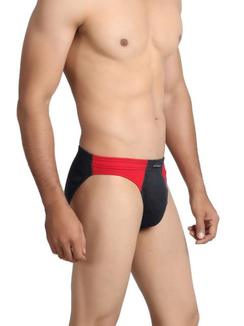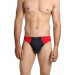 Black brief, red panels near side seam in front, cloth covered elasticized waistband with brand patch in front, double layered front for extra support and comfort, high cut design allows free leg movement, printed branding on the inside offers abrasion-free comfort