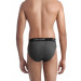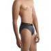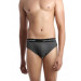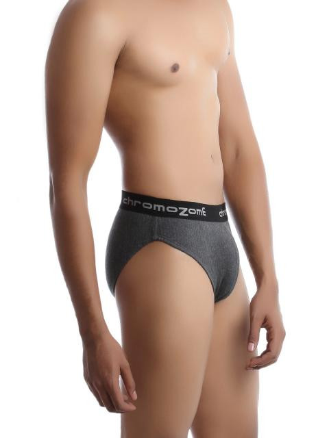 Dark grey briefs with elasticated waistband that has branding, double layered front pouch, elasticated leg holes, full back coverage