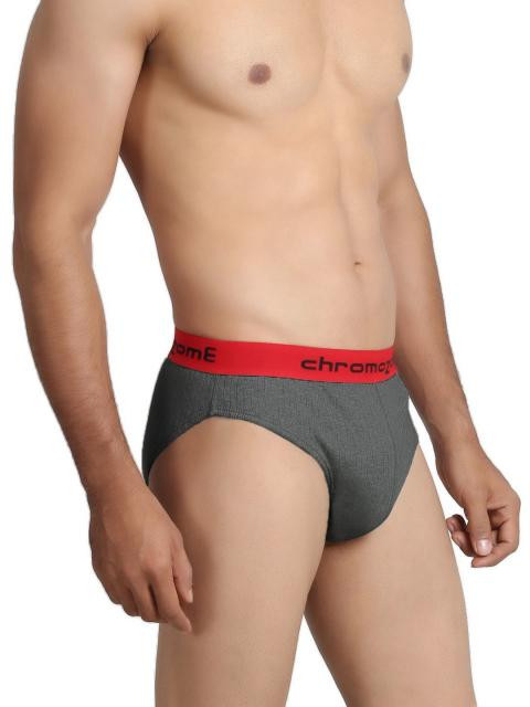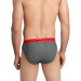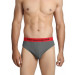 Dark grey briefs with elasticated waistband that has contrast coloured branding, double layered front pouch, elasticated leg holes, full back coverage