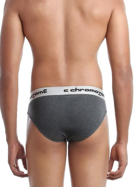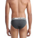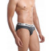 Grey briefs that has a broad, elasticated silver coloured waistband, stitch detailing, printed branding on the waistband and elasticated at the legs for enhanced comfort