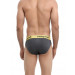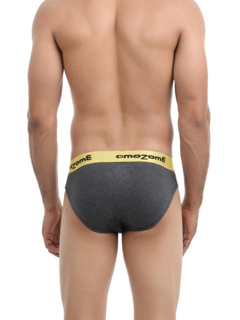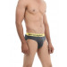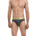 Charcoal grey briefs that has a broad, elasticated gold coloured waistband, stitch detailing, printed branding on the waistband and elasticated at the legs for enhanced comfort