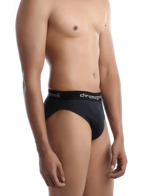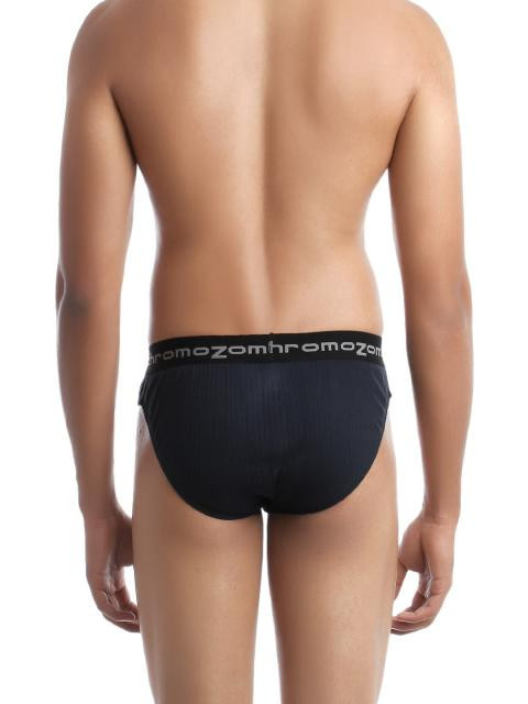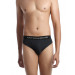 Navy blue briefs with elasticated waistband that has branding, double layered front pouch, elasticated leg holes, full back coverage