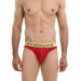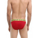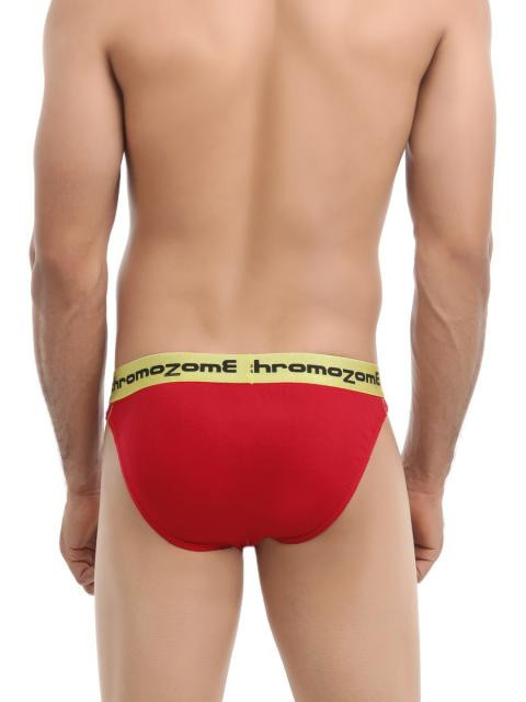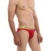Red briefs that has a broad, elasticated gold coloured waistband, stitch detailing, printed branding on the waistband and elasticated at the legs for enhanced comfort