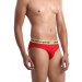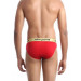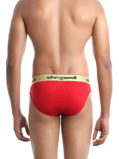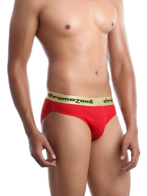 Red briefs that has a broad, elasticated gold coloured waistband, stitch detailing, printed branding on the waistband and elasticated at the legs for enhanced comfort