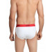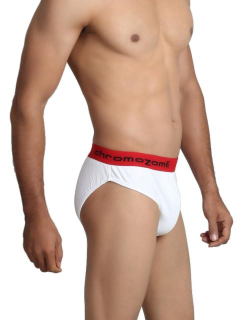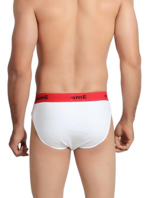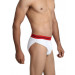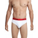 White briefs with elasticated waistband that has contrast coloured branding, double layered front pouch, elasticated leg holes, full back coverage