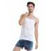Sleeveless white vest with a squarish neckline, contoured body fit, contrast ribbing around the neck and arm openings, branding at the back below the neck