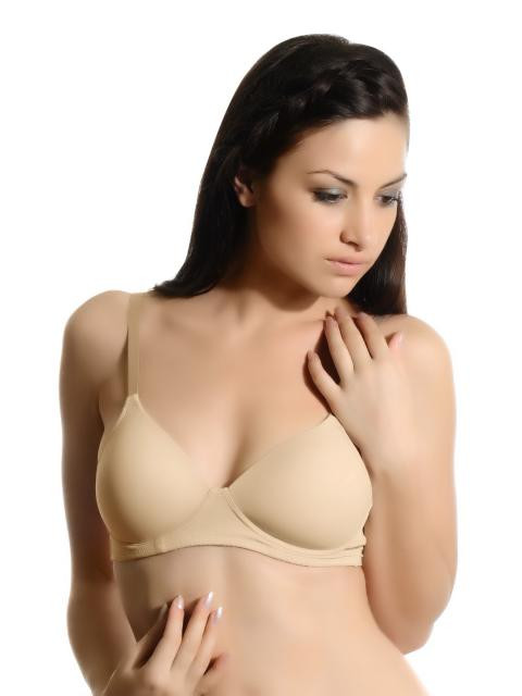 Nude coloured brassiere, has moulded and padded cups, concealing petals inside, regular adjustable straps, adjustable double hook and eye closure at the back and a smooth look to be worn under tight fitting clothes
