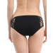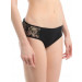 Black bikini brief made of soft and stretchy cotton/spandex fabric, sits just below the waist, has a pure cotton panel inside, an elasticated waistband and lace detailing on the sides
