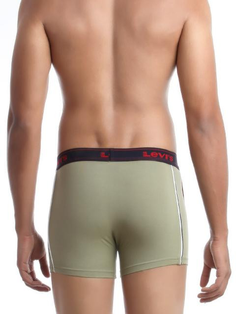 Boxer briefs from Levi's in olive green and navy, made of 95% combed cotton and 5% elastane for comfort, softness and stretch. Levi's name written on waistband and 'Levi Strauss & co' written across back. Slim white, green and red piping decorating side seams on front and back