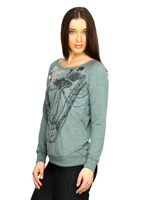Moss green round neck t-shirt made of 200GSM looper knit fabric, with full arm sleeves that have broad and flat hems, flat hem and graphic print on the front