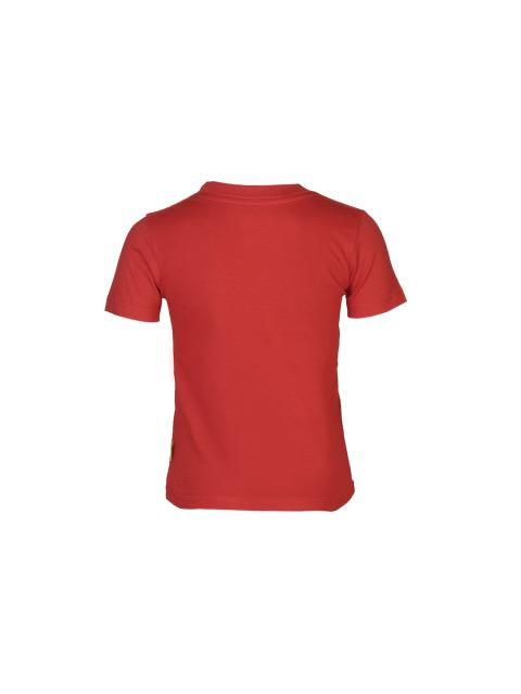 Red t-shirt that has a round neck, short sleeves, graphic and rubber print on the front, stitch detailing and brand badge above the left hem