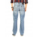 Washed blue jeans made of 100% cotton fabric, that has two insert pockets on the front, two patch pockets on the back with stitch detailing, brand patch appliqued on the waistband at the back and metal zipper and button closure on the front
