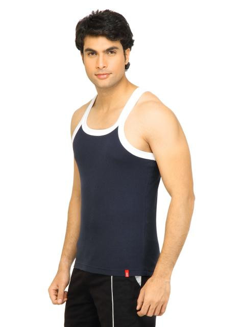 Soft and absorbent 100% combed cotton vest. This is a navy vest with bold white trim, it has a square shaped neck and armhole binding which forms the straps over the shoulder. The Levi's logo features prominently on the back neck plus the signature red tag is stitched to the bottom hem