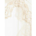 Cream full length nightdress made of stretchy net fabric, has a V-neckline, adjustable shoulder straps, golden embellishment with a bow detail on the left shoulder strap, lace trims at the bust region and hem, has a cut-out detail at the back and side slit
