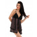 Black strappy night dress with frills at the bust, printed pink hearts below the bust, open from below the bust to the hem in the front and ruffles at the hem