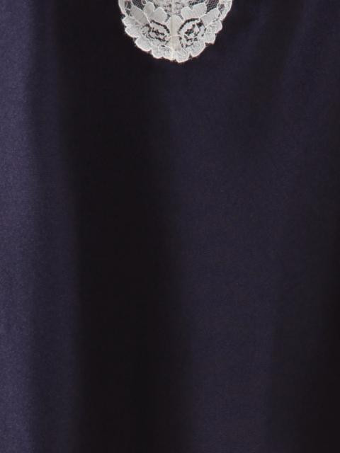 Navy blue nightdress, has a V neckline with lace detail at the neckline, adjustable spaghetti straps, a small slit on the left side at the hemline and lace detail at the hemline and slit