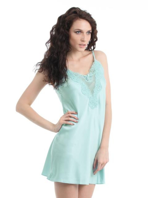 Turquoise blue satin night dress with a V-neckline with embroidered lace with sequin detailing at the neckline, bow detail in the centre, scalloped lacing at the back and thin and adjustable shoulder straps