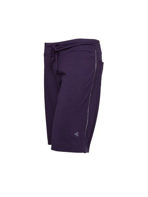 Knee length purple lounge shorts, has an elasticated waistband with drawstring fastening, contrast pipping along side seams, print towards hem, curved yoke and two insert pockets at back