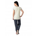 Cream top with short sleeves, grey piping, print on the chest, V neck.