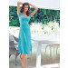 Bluish green long dress, has a grey panel at the shoulder and back chest, a V-neckline and a patch behind the neckline, short sleeves and a flared hemline