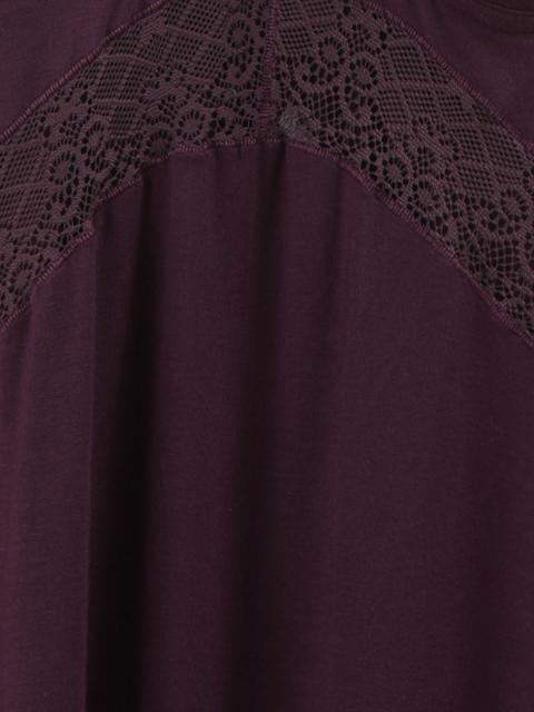 Grape sleeveless nightdress, has a V neckline, spaghetti straps,  lace trimmings at the bust line, inner padding, lace detailing below the bust and a flowy hemline