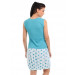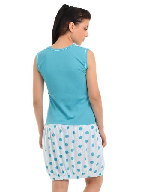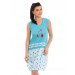 Pink knee-length nightdress with patterning all over, has a round neck, is sleeveless, embellishments and ruffles at the yoke and an elasticated hem