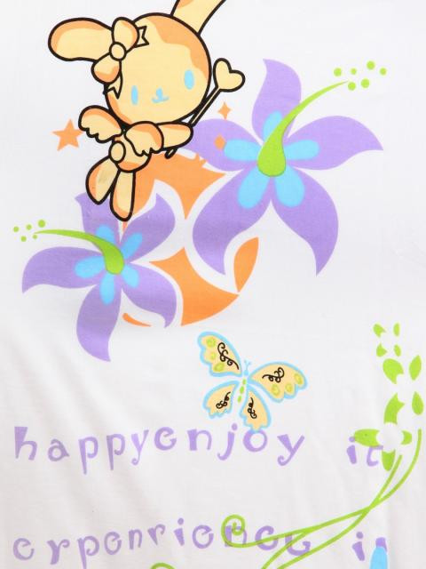 White knee-length night dress with lavender trims, tie-ups at the shoulder, flared ruffles at the hem and print on the front