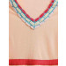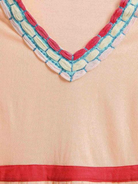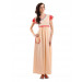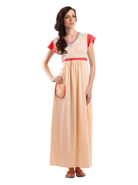 Peach nightdress with a V-neckline, cap sleeves, panel stitch around the neckline, paneling at the yoke, tie-up detail at the waist and a patch pocket on the right front