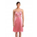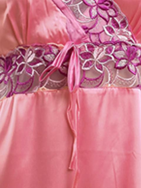 Pink satin knee- length nightdress with a V-neckline, lace and tie-up detail at the yoke, thin adjustable shoulder straps and elastication at the back