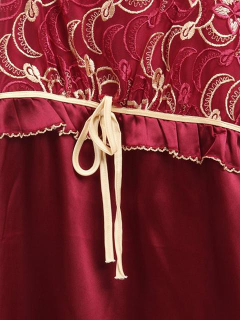Maroon satin nightwear with a square neckline, thin and adjustable shoulder straps, net and lace detail with a tie-up detail at the yoke, elastication at the back and lace scalloped detail at the hemline