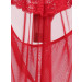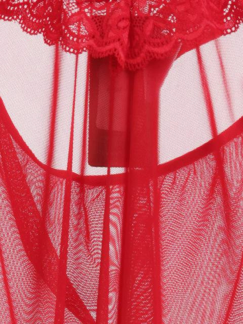 Red semi sheer halter neck nightdress, has a V-neckline with lace detailing and a fabric strap in the centre and ruffles at the hem