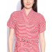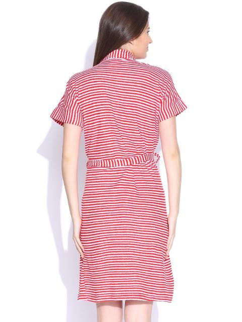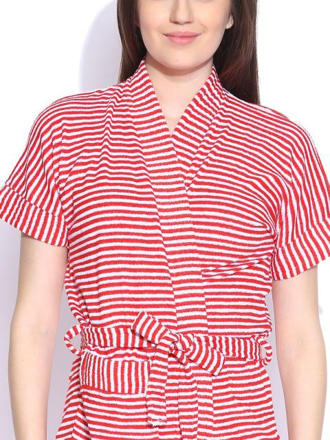 Red and white striped bath robe, has an open front, short grown-on sleeves, a patch pocket, and belt loops at the waist, and an attached belt on the back