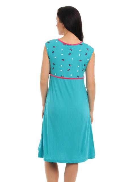 Blue knee-length sleeveless nightdress with pintucks at the yoke and a layer stitched to look like a shrug with prints