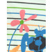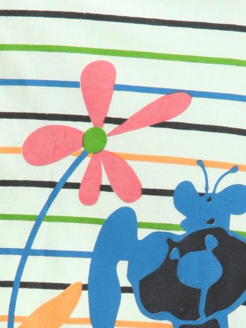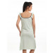 Light green knee-length night dress with blue trims, has tie-ups at the shoulder and front, has printed stripes on the front.
