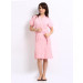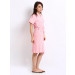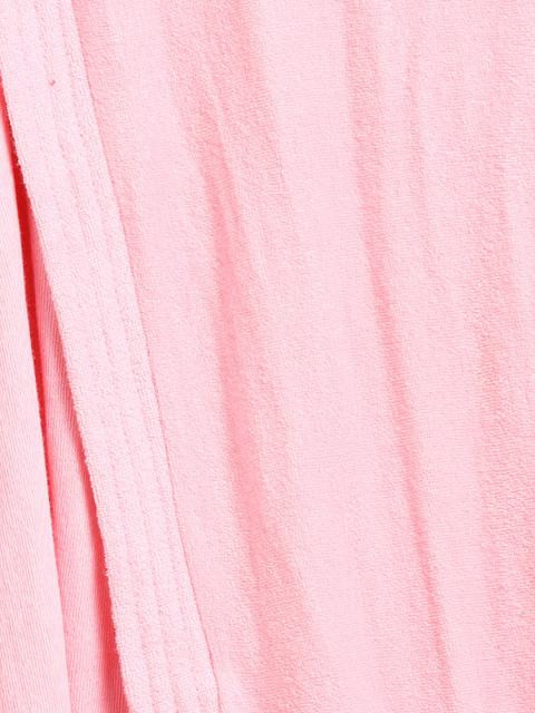 Light pink bath robe, short extended sleeves, patch pocket on front right side, inner tie-ups at waist, belt loop at waist sides, tie stitched down at back waist