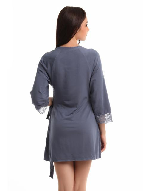 Blue robe, has a V-neck, an open front with a tie-up detail, three quarter sleeves with lace cuffs
