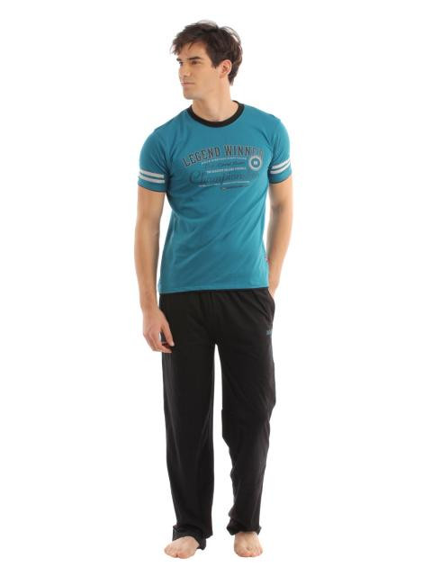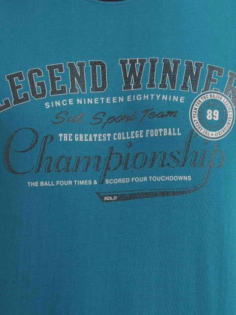 Blue T-shirt, has a round neck, short sleeves, print on the chest
