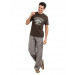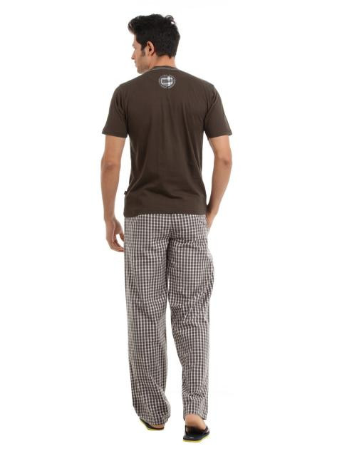 Brown checked pyjama with an elasticated waistband with drawstrings, side pockets and zipped pocket on the right back hip