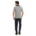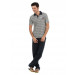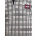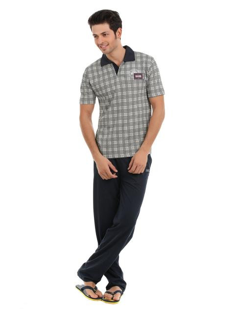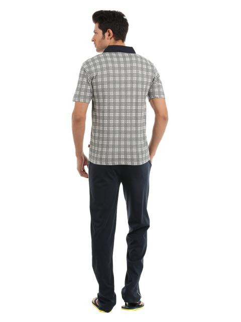 Navy blue and grey checked polo T-shirt, has a grey spread collar and a V-neckline with an open placket and short sleeves
