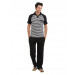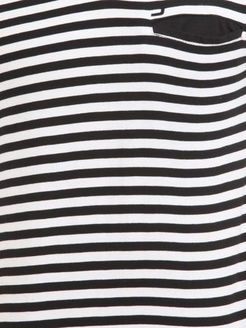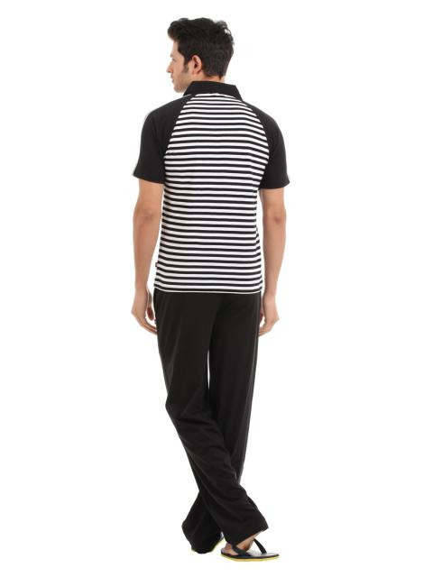 Black and white striped polo T-shirt, has a spread collar and a V-neckline with an open placket and short sleeves