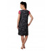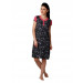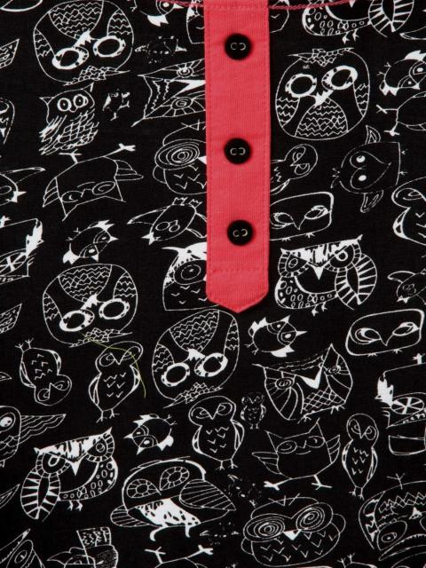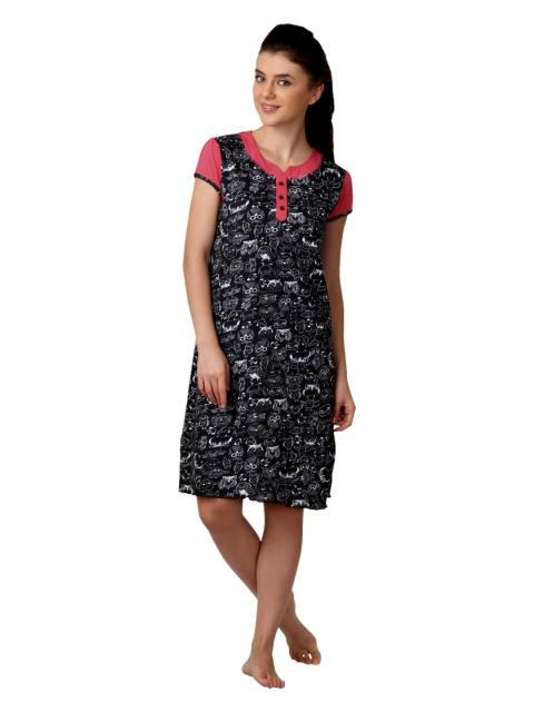 Black printed knee-length nightdress, has a round neckline with a split, mock chest button placket, short sleeves in pink and side slits