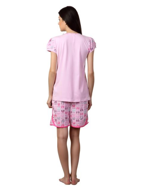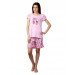 Pink in colour with printed design, round neck, short sleeves with press button cuffs, available pyjama shorts in pink with printed design and adjustable drawcord, also pink pyjama with elasticated waist with draw cord and two pockets on either side