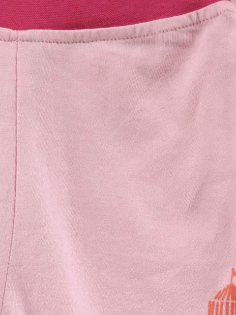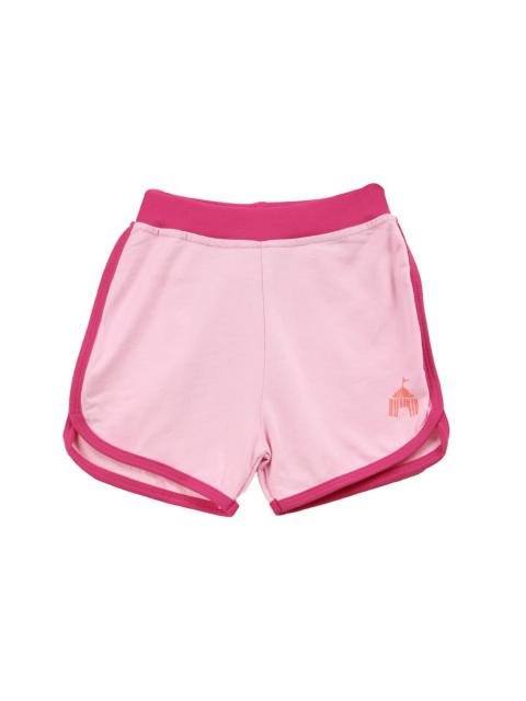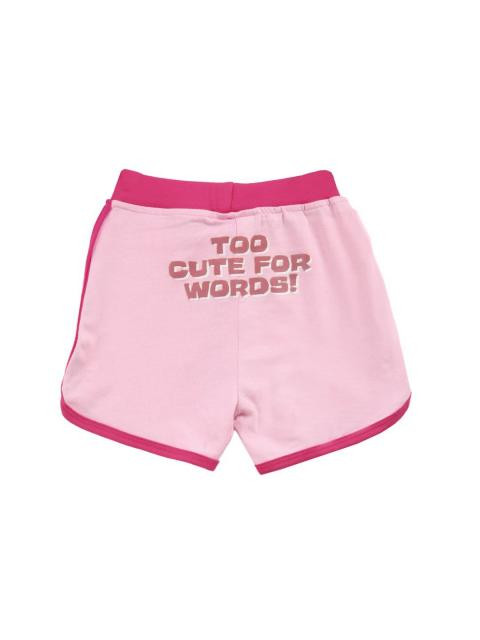 Pink shorts with dark pink taping on side and bottom hem, a soft elasticated waist band, graphic print on left bottom hem and back