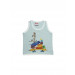 Blue vest with printed front, round neck, sleeveless, white binding at neck, armhole and bottom hem